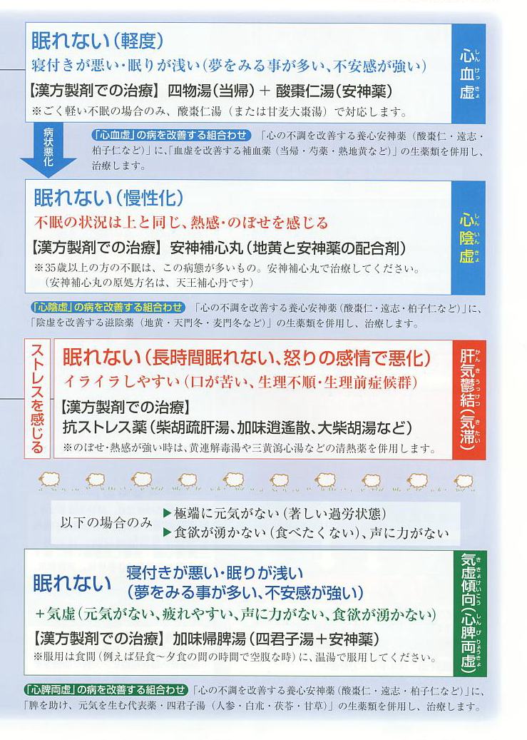 ①眠れない(軽度)→ 寝つきが悪い、眠りが浅い(夢を見る、不安感が強い)→ 四物湯、酸棗仁湯、甘麦大棗湯